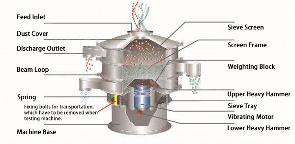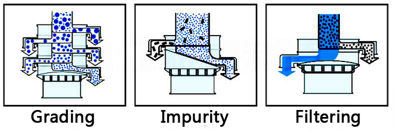 The rotating motion of the motor is transformed into a horizontal, vertical and inclined three-dimensional motion by using the heavy hammer (unbalanced weight) installed up and down the motor shaft, and then the motion is transmitted to the screen surface to make the material do an outward involute motion on the screen surface. Hence, it is also called rotary vibrating screen. This series of rotary vibrating screen has advantages of long running track and high utilization rate of screen surface. Adjusting the phase angle of heavy hammers at the upper and lower ends changes the moving track of materials on screen surface for precisely fine screening and probability sieving, and etc.